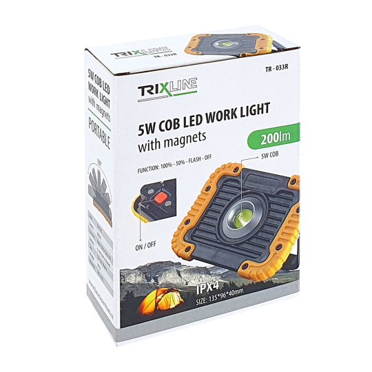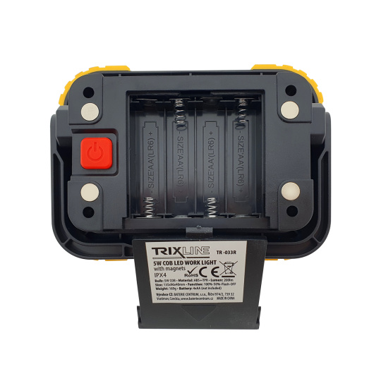 Pracovné COB LED svietidlo TR-033R Trixline má 3 režimy svietenia 100%/50% a preblikávanie. Napájaná pomocou 4xAA LR6 ceruzkových alkalických batérií (nie sú súčasťou balenia). Krytie IPX4 chránené proti striekajúcej vode. Zapínanie na zadnej strane svietidla. Je možné magneticky uchytiť alebo položiť a upraviť výšku sklonu.