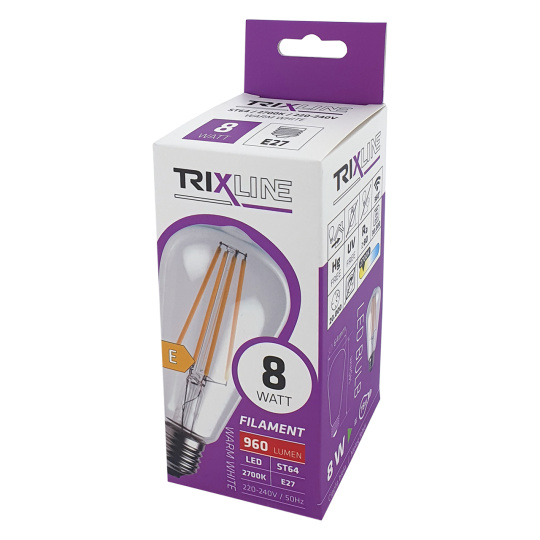 DEKORAČNÁ LED RETRO ŽIAROVKA TRIXLINE s päticou E27 a príkonom 8W ≅ 78W. Dekoratívna žiarovka imituje prvé Edisonove žiarovky. Vďaka LED technológii je aj mimoriadne úsporná. Používajú sa najmä do retro svietidiel, alebo je možné použiť aj ako voľne visiace na samostatnom závese. Potom tvorí veľmi dekoratívny prvok osvetlenia najčastejšie sa používa v hoteloch, reštauráciách a pod.
