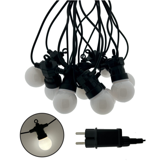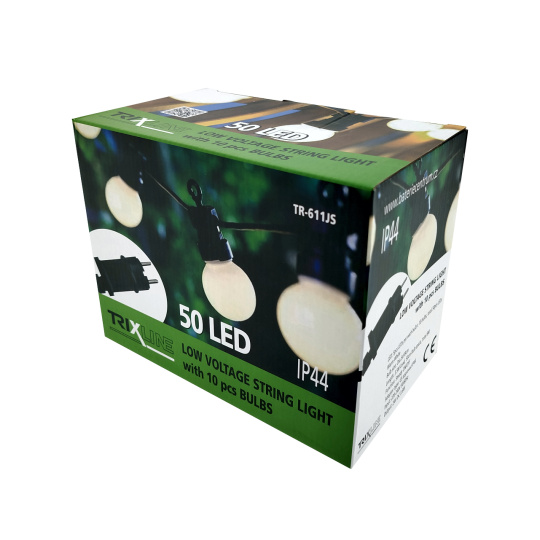 Vytvorte si príjemnú atmosféru na záhrade, terase alebo balkóne s dekoratívnym LED osvetlením TR-611JS. Tento svetelný reťaz obsahuje 10 štýlových žiaroviek, z ktorých každá ukrýva 5 LED diód teplej bielej farby (2700K) – celkovo teda 50 LED na celkovej dĺžke 8 metrov.Robustné plastové prevedenie s krytím IP44 zaisťuje odolnosť voči poveternostným vplyvom, a je tak ideálne pre vonkajšie použitie. Svetelný reťaz je napájaný zo siete (220–240V) a má bezpečný výstup 24V DC / 3,6W. Vďaka 3,5 metrovému prívodnému káblu je inštalácia jednoduchá a flexibilná.
