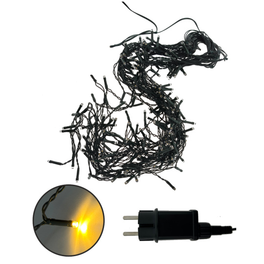 Tento svetelný reťaz obsahuje 200 LED svetielok v teplej bielej farbe (2700K) na celkovej dĺžke 7,6 metra.Kvalitné plastové prevedenie s krytím IP44 zaisťuje odolnosť voči poveternostným vplyvom, a je tak ideálne pre vonkajšie použitie. Svetelný reťaz je napájaný zo siete (220–240 V) a má bezpečný výstup 5V DC / 3,6W. Vďaka 3 metrovému prívodnému káblu je inštalácia jednoduchá a flexibilná.
