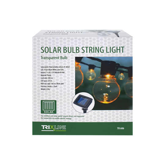 Dekoratívne LED solárne, vonkajšie osvetlenie (reťaz/girlanda) TR 606 Trixline . Vytvára príjemnú atmosféru záhrady, pergoly, altánku, terasy, balkóna a pod. Možno voľne položiť na stoly, parapety, police alebo zavesiť na zábradlia, ploty, slnečníky, stromy, stĺpy, omotať na trámy alebo prevesy pri strope či voľne do priestoru. Čierny kábel o dĺžke 2m je tvorený 10timi LED plastovými, priehľadnými žiarovkami, vyžarujú teplú farbu svetla. Výhodou plastových žiaroviek oproti skleneným je ich nerozbitnosť, odolnosť a dlhšia životnosť. Vďaka solárnemu panelu ušetríte energiu a nie ste obmedzení pripojením do elektrickej siete. Cez deň sa nabíja av noci rozsvieti. Má voliteľné 2 režimy svietenia (S) stabilné a (F) blikajúce.