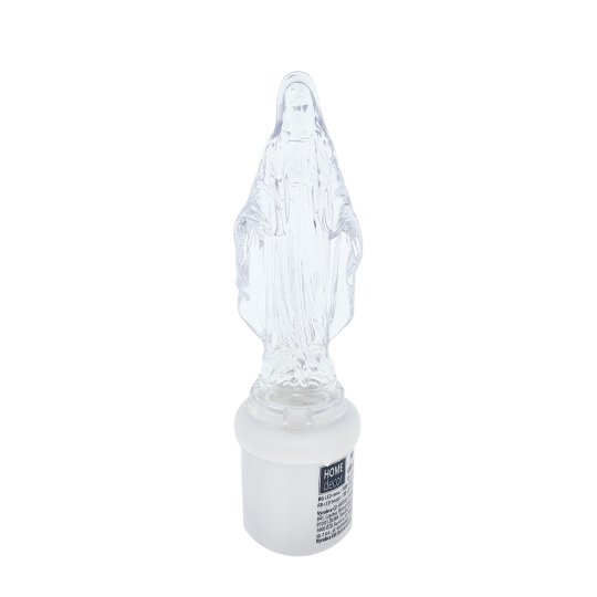 Biela LED sviečka krištáľovo priehľadná Panna Mária HD-135 HOME DECOR s bielym blikajúcim plamienkom.Vhodná alternatíva klasickej sviečky. Jednoduché a bezpečné použitie bez rizika požiaru. Zapnutie pootočením veka. Napájané pomocou 2x C R14 UM2 batérií (sú súčasťou).