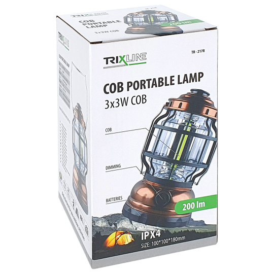 Outdoorové LED COB svietidlo TR-217R Trixline s výklopnou úchytkou zaisťuje dostatok svetla pomocou LED COB (chip on board) 3x3W čo je technológia spočívajúca v koncentrácii jednotlivých LED čipov na malej ploche.Rotáciou OFF/ON kolieska na tele svietidla je možné regulovať jas svetla.Zdrojom energie sú 3xAA 1,5V ceruzkové batérie (nie sú súčasťou balenia), odporúčame kvalitné alkalické batérie. Vďaka odolnosti proti striekajúcej vode IPX4 lampáš ponúka široké využitie pri kempovaní, rybárčení, stanovaní, pikniku, grilovaní a pri ďalších vonkajších aktivitách. V ponuke máme 3 farebné prevedenie čiernu, zlatú a zelenú.