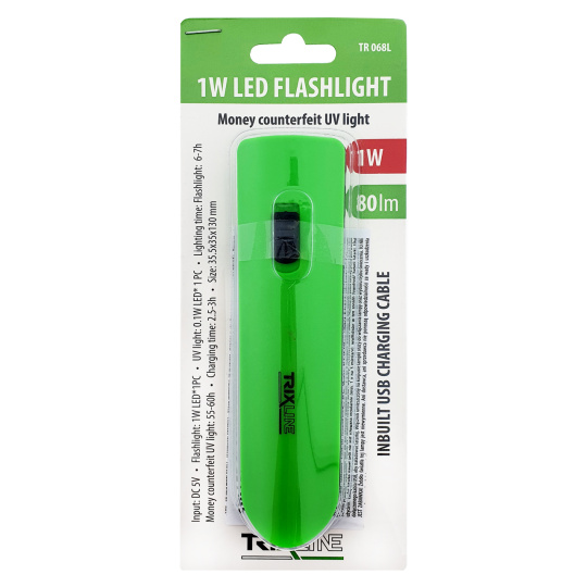 LED svietidlo s UV testrom bankoviek TR 068L Trixline - zelená.Výhodou svietidla je integrovaný USB nabíjací kábel.Posuvným vypínačom na tele svietidla volíme režim predného LED 1W svietenia alebo UV 0,1W LED detektor , ktorý dokáže overiť ochranné prvky bankoviek - vodoznak, okienkový prúžok s mikrotextom, farebné vlákna. Pred prvým použitím svietidlo plne nabite. Nabíjajte aj v prípade, že nie je pravidelne používaná (min. 1x za 3 mesiace), predĺžite tým životnosť akumulátora svietidla.
