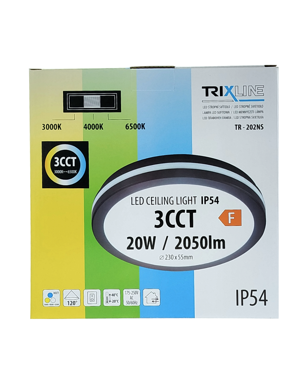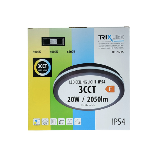 Moderné a výkonné LED CCT stropné svietidlo TR-202NS Trixline - o priemere 23cm a výške 5,5cm poskytuje kvalitné a rovnomerné osvetlenie o sile 2050 lúmenov. Perfektne sa hodí pre obytné priestory, ako sú obývacie izby, spálne, kuchyne, kúpeľne či chodby, rovnako tak pre pracovne, kancelárie, technické miestnosti, garáže, kryté vonkajšie priestory a pre komerčné priestory.Nastaviteľné CCT umožňuje voľbu teplej, neutrálnej alebo studenej bielej farby svetla (3000K/4000K/6500K) pre optimálne prispôsobenie atmosféry každému priestoru. Príjemné a efektívne osvetlenie, ktoré splní vaše estetické aj praktické požiadavky.