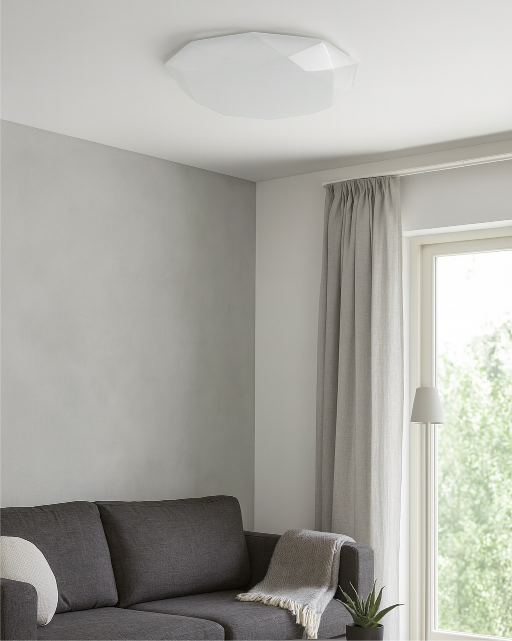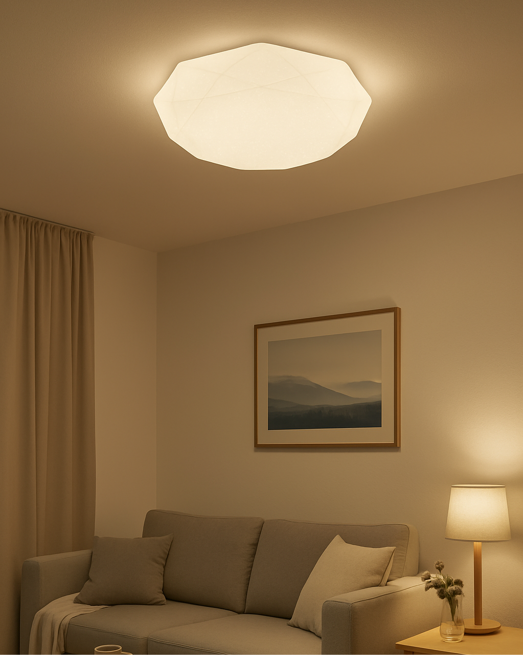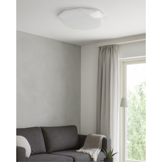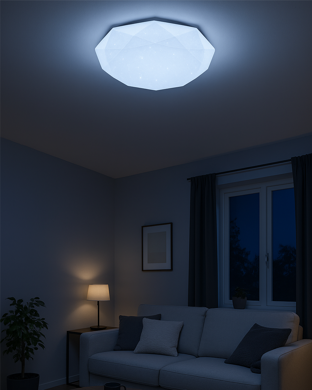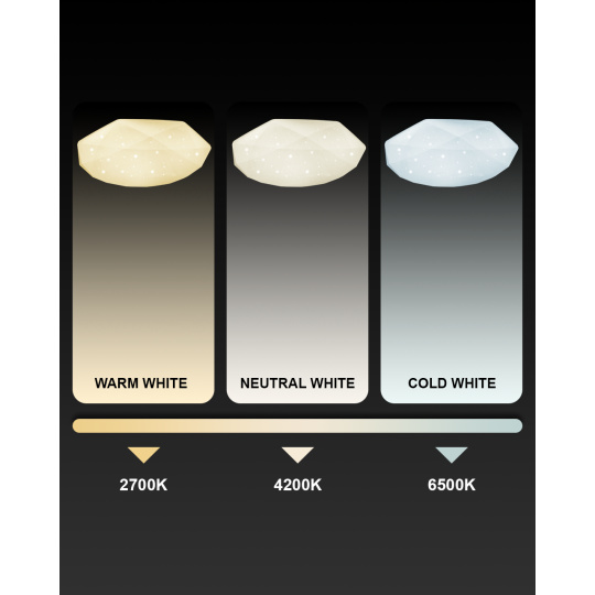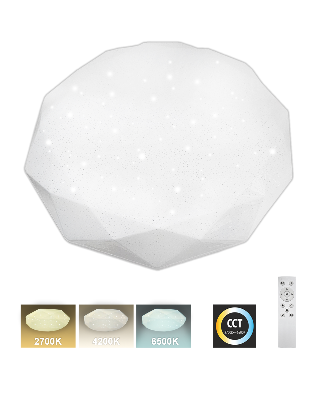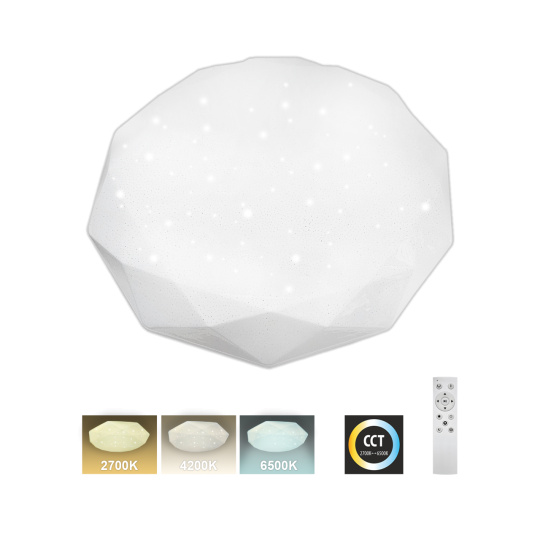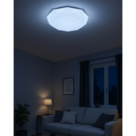 LED stropné svietidlo TR-600C - INDUS Trixline v bielej farbe s trblietavým efektom je určené do vnútorných priestorov ako sú obývacie izby, spálne, haly, kancelárie, chodby a podobné miesta. Pomocou priloženého ovládača môžete prepínať medzi tromi svetelnými teplotami v rozmedzí 2700K až 6500K , ktoré je možné stmievať podľa potreby pre navodenie príjemnej atmosféry. Pri maximálnom stlmení klesá spotreba až na iba 8W z pôvodných 60 W, čo zaručuje úsporu energie.Ďalšou možnosťou na diaľkovom ovládači je aj nočný režim a funkcia 30 sekúnd po uplynutí ktorých sa LED svietidlo samo vypne. Svietidlo si po vypnutí pamätá posledný nastavený režim , čo zaisťuje pohodlné a intuitívne používanie.