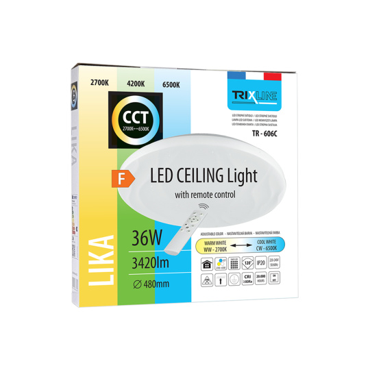LED stropné svietidlo TR-606C - LIKA Trixline v bielej farbe s trblietavým efektom je určené do vnútorných priestorov ako sú obývacie izby, spálne, haly, kancelárie, chodby a podobné miesta. Pomocou priloženého ovládača môžete prepínať medzi tromi svetelnými teplotami v rozmedzí 2700K až 6500K , ktoré je možné stmievať podľa potreby pre navodenie príjemnej atmosféry. Pri maximálnom stlmení klesá spotreba až na iba 6W z pôvodných 36W, čo zaručuje úsporu energie.Ďalšou možnosťou na diaľkovom ovládači je aj nočný režim a funkcia 30 sekúnd po uplynutí ktorých sa LED svietidlo samo vypne. Svietidlo si po vypnutí pamätá posledný nastavený režim , čo zaisťuje pohodlné a intuitívne používanie.