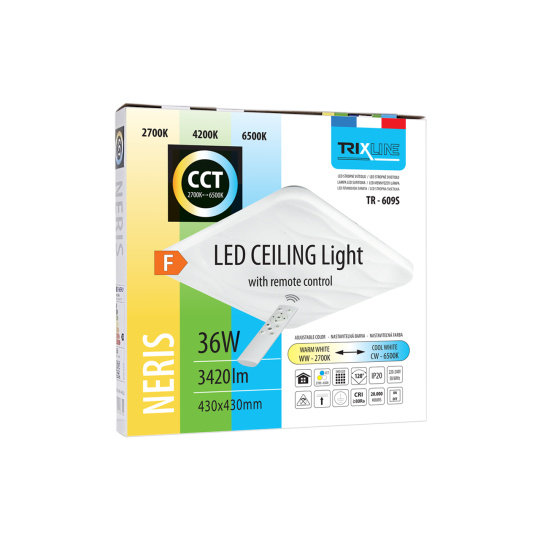LED stropné svietidlo TR-609S - NERIS Trixline v bielej farbe s trblietavým efektom je určené do vnútorných priestorov ako sú obývacie izby, spálne, haly, kancelárie, chodby a podobné miesta. Pomocou priloženého ovládača môžete prepínať medzi tromi svetelnými teplotami v rozmedzí 2700K až 6500K , ktoré je možné stmievať podľa potreby pre navodenie príjemnej atmosféry. Pri maximálnom stlmení klesá spotreba až na iba 6W z pôvodných 36W, čo zaručuje úsporu energie.Ďalšou možnosťou na diaľkovom ovládači je aj nočný režim a funkcia 30 sekúnd po uplynutí ktorých sa LED svietidlo samo vypne. Svietidlo si po vypnutí pamätá posledný nastavený režim , čo zaisťuje pohodlné a intuitívne používanie.