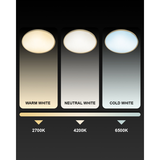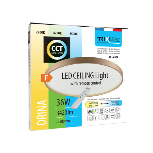 LED stropné svietidlo TR-616C - DRINA Trixline v zlatej farbe je určené do vnútorných priestorov ako sú obývacie izby, spálne, haly, kancelárie, chodby a podobné miesta. Pomocou priloženého ovládača môžete prepínať medzi tromi svetelnými teplotami v rozmedzí 2700K až 6500K , ktoré je možné stmievať podľa potreby pre navodenie príjemnej atmosféry. Pri maximálnom stlmení klesá spotreba až na iba 6W z pôvodných 36W, čo zaručuje úsporu energie.Ďalšou možnosťou na diaľkovom ovládači je aj nočný režim a funkcia 30 sekúnd po uplynutí ktorých sa LED svietidlo samo vypne. Svietidlo si po vypnutí pamätá posledný nastavený režim , čo zaisťuje pohodlné a intuitívne používanie.