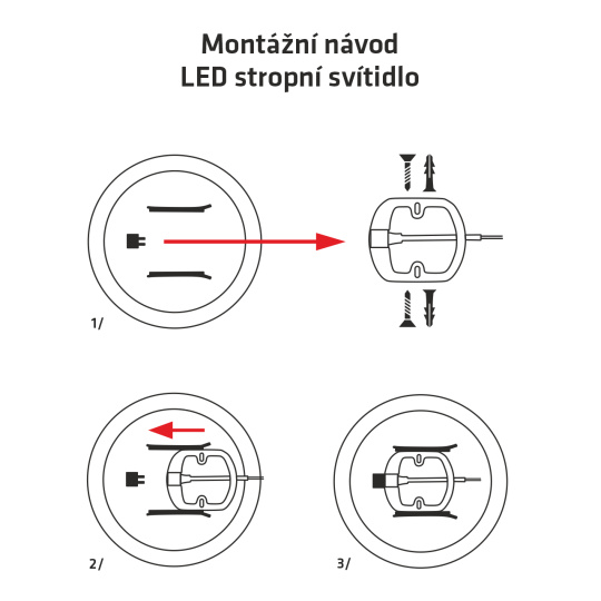 - Pripevnite držiak svetla k pevnému podkladu napr. na strop múr apod. (súčasťou balenia 2 skrutky, 2 hmoždinky).
