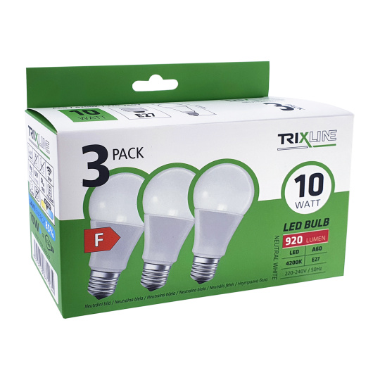 LED ŽIAROVKY TRIXLINE vo výhodnom balení po 3 kusoch. Úsporná LED žiarovka s päticou E27 je šetrná k životnému prostrediu, neobsahuje žiadnu ortuť ani olovo. Na rozdiel od vláknových žiaroviek zvláda aj extrémne nízke a vysoké teploty .� Jej životnosť dosahuje až 30 000 hodín.� Vďaka LED žiarovke 10W ušetríte 85% energie, výborne poslúži ako náhrada za klasickú 73W žiarovku.LED žiarovka sa po zapnutí okamžite rozsvieti bez akéhokoľvek oneskorenia a vyžaruje príjemné neutrálne biele svetlo 4200K. Žiarovku môžete použiť v kuchyni alebo kúpeľni, farba svetla je ideálna pre miesta s nedostatkom denného svetla.