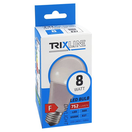 LED úsporná žiarovka TRIXLINE s päticou E27, šetrná k životnému prostrediu, neobsahuje žiadnu ortuť ani olovo, navyše sa dobre osvedčuje aj pri extrémne nízkych aj vysokých teplotách, kedy s vláknovými žiarovkami bývajú problémy.Jej životnosť dosahuje až 30 000 hodín.Vďaka svojmu výkonu 8W výborne poslúži ako náhrada za klasickú 75W žiarovku.LED žiarovka sa po zapnutí okamžite rozsvieti bez akéhokoľvek oneskorenia a vyžaruje studené biele svetlo 6500K.