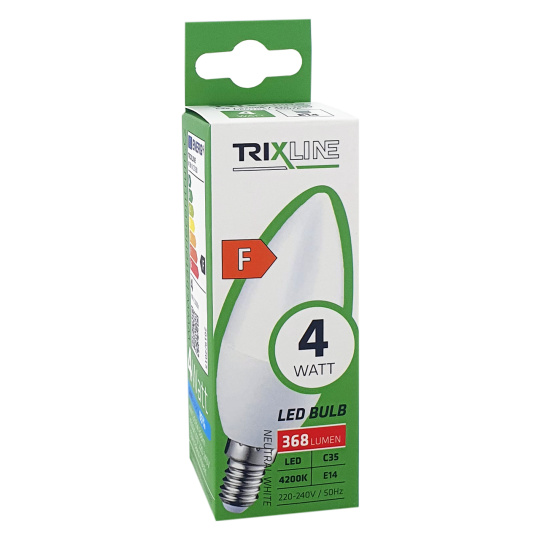 LED úsporná žiarovka TRIXLINE (ušetríte 85% energie) s päticou E14 , šetrná k životnému prostrediu, neobsahuje žiadnu ortuť ani olovo, navyše sa dobre osvedčuje aj pri extrémne nízkych aj vysokých teplotách, kedy s vláknovými žiarovkami bývajú problémy.Jej životnosť dosahuje až 30 000 hodín.Vďaka svojmu výkonu 4W výborne poslúži ako náhrada za klasickú 37W žiarovku.LED žiarovka sa po zapnutí okamžite rozsvieti bez akéhokoľvek oneskorenia a vyžaruje príjemné neutrálne biele svetlo 4200K.