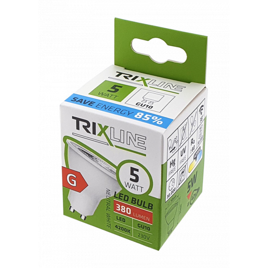 LED BODOVÁ ŽIAROVKA TRIXLINE je úsporná LED žiarovka s päticou GU10, šetrná k životnému prostrediu, neobsahuje totiž žiadnu ortuť ani olovo, navyše sa dobre osvedčuje aj pri extrémne nízkych aj vysokých teplotách, kedy s vláknovými žiarovkami bývajú problémy.� Jej životnosť dosahuje až 30 000 hodín.� Vďaka svojmu výkonu 5W výborne poslúži ako náhrada za klasickú 42W žiarovku.LED žiarovka sa po zapnutí okamžite rozsvieti bez akéhokoľvek oneskorenia a vyžaruje príjemné neutrálne biele svetlo 4200K.