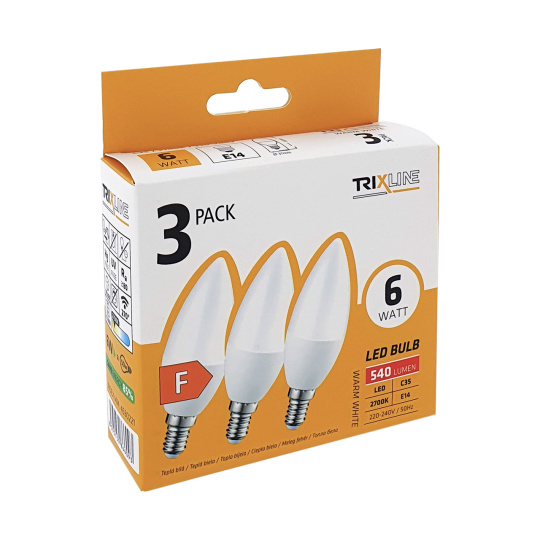 Bezpečnostné informácie (PDF)LED žiarovka Trixline 6W C35 E14 teplá biela 3 PACK