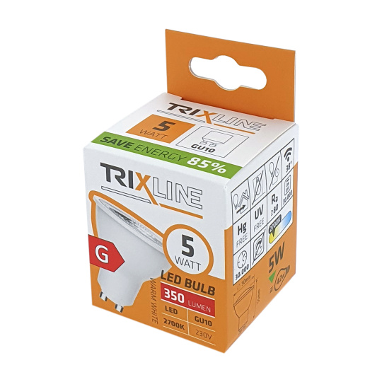 Úsporná LED žiarovka Trixline s päticou GU10, šetrná k životnému prostrediu, neobsahuje žiadnu ortuť ani olovo, navyše sa dobre osvedčuje aj pri extrémne nízkych aj vysokých teplotách, kedy s vláknovými žiarovkami bývajú problémy.Jej životnosť dosahuje až 30 000 hodín.Vďaka svojmu výkonu 5W výborne poslúži ako náhrada za klasickú 42W žiarovku. LED žiarovka sa po zapnutí okamžite rozsvieti bez akejkoľvek oneskorenia a vyžaruje príjemné teplé biele svetlo 2700K.