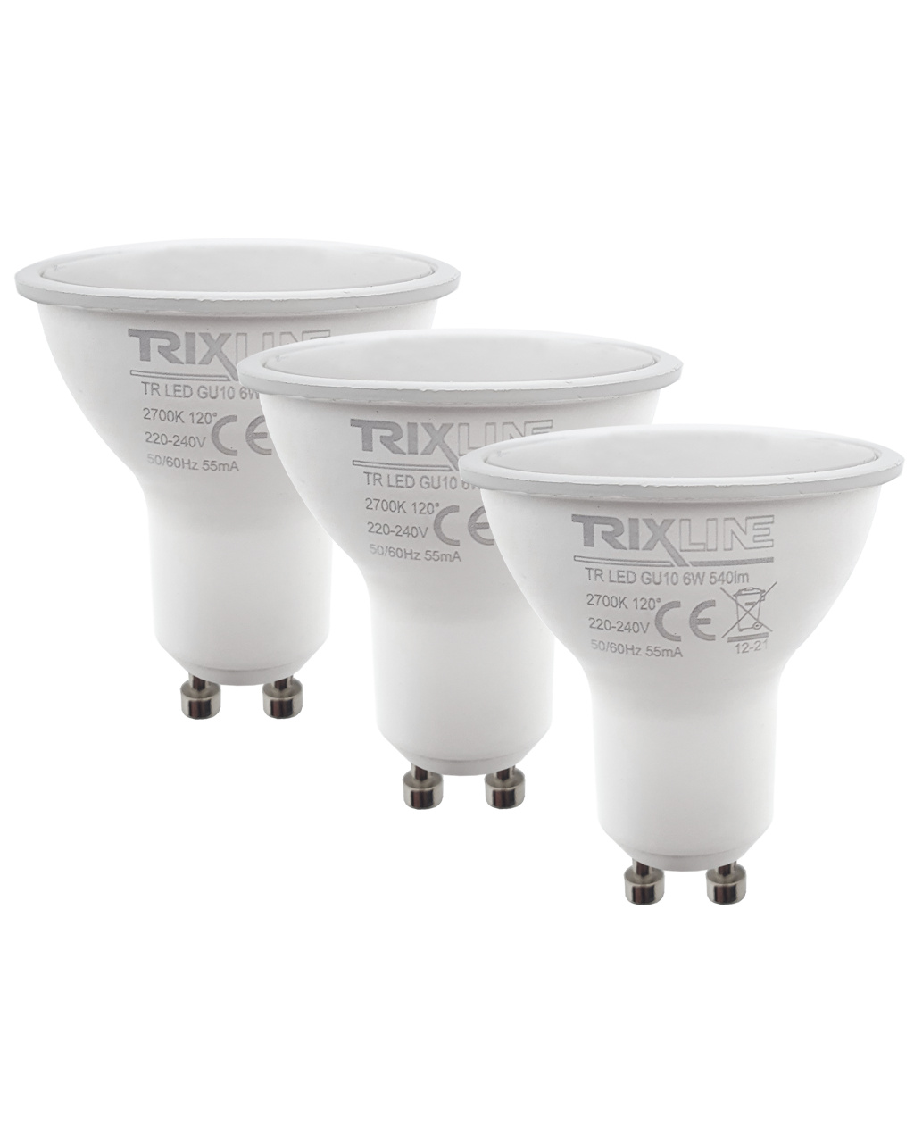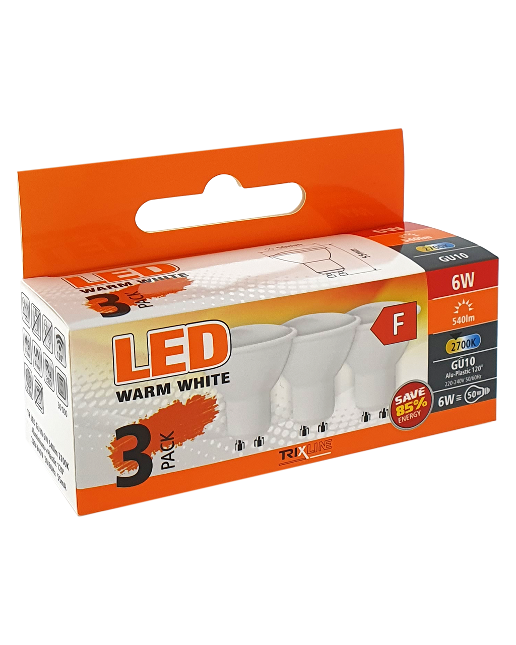 BODOVÉ LED ŽIAROVKY TRIXLINE vo výhodnom balení po 3 kusoch. Úsporná LED žiarovka s päticou GU10 je šetrná k životnému prostrediu, neobsahuje žiadnu ortuť ani olovo. Na rozdiel od vláknových žiaroviek sa osvedčuje aj pri extrémne nízkych a vysokých teplotách.Jej životnosť dosahuje až 30 000 hodín. Vďaka svojmu výkonu 6W výborne poslúži ako náhrada za klasickú 50W žiarovku. LED žiarovka sa po zapnutí okamžite rozsvieti bez akejkoľvek oneskorenia a vyžaruje príjemné teplé biele svetlo 2700K.Žiarovku môžete použiť v spálni, obývačke a pod.