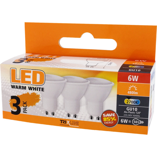 BODOVÉ LED ŽIAROVKY TRIXLINE vo výhodnom balení po 3 kusoch. Úsporná LED žiarovka s päticou GU10 je šetrná k životnému prostrediu, neobsahuje žiadnu ortuť ani olovo. Na rozdiel od vláknových žiaroviek zvláda aj extrémne nízke a vysoké teploty. Jej životnosť dosahuje až 30 000 hodín. Vďaka svojmu výkonu 6W výborne poslúži ako náhrada za klasickú 50W žiarovku. LED žiarovka sa po zapnutí okamžite rozsvieti bez akejkoľvek oneskorenia a vyžaruje príjemné teplé biele svetlo 2700K. Žiarovku môžete použiť v spálni alebo detskej izbe, farba svetla je ideálna na odpočinok.