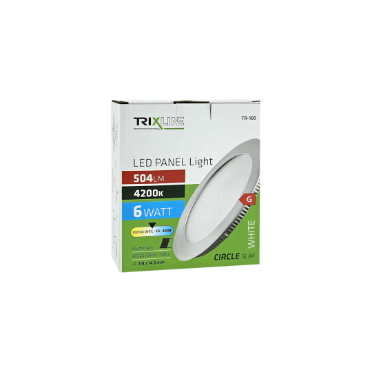 Kruhový vstavaný LED panel Trixline TR-100 s výkonom 6W so svetelným tokom 504lm a neutrálnou bielou farbou svetla 4200K.Panel je vyrobený z kvalitného hliníka. Vďaka použitej LED technológii ušetríte až 85% energie.Je určený do interiéru na zapustenie do sadrokartónu s montážnym otvorom s priemerom ± 10,3cm.Vonkajší rozmer svetla je ø11,8x1,45cm.Rýchla a jednoduchá inštalácia.