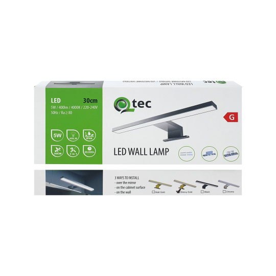 Prednosťou kúpeľňového nástenného osvetlenia Q-304G Qtec 5W je moderný dizajn , kvalitné spracovanie , stupeň krytia IP44 umožňuje inštalovať svetlo do miestnosti so zvýšenou vlhkosťou napr. kúpeľne, 3v1 spôsoby montáže na zrkadlo, skrinku alebo stenu. Zdrojom svetla sú energeticky úsporné LED diódy, ktoré vyžarujú neutrálnu bielu farbu svetla 4000K príjemnú pre oči. Kúpeľňové osvetlenie ponúkame v 4 farebných variantoch - matné zlaté - lesklé zlaté - čierne - chróm.
