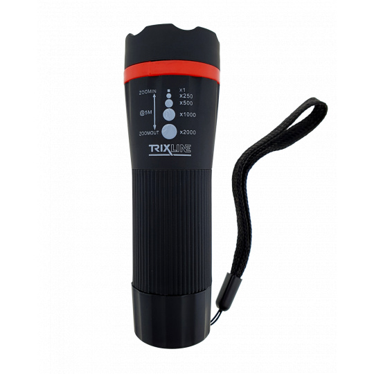 Ručné LED svietidlo so zoomom . Vyniká predovšetkým svojou vysokou svietivosťou, nastaviteľnou šírkou svetelného kužeľa a dosvitom až 5m.Režim svietenia ON/OFF, zoom x1/x250/x500/x1000/x2000.