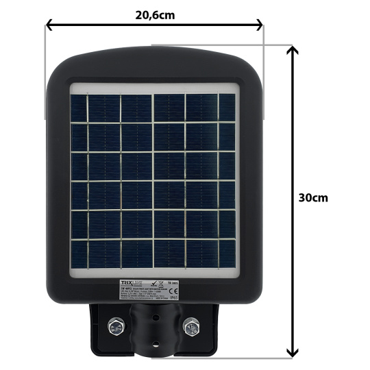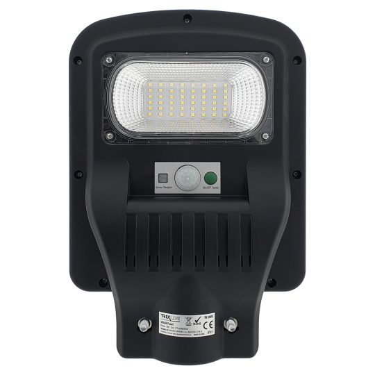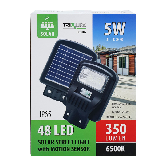 Solárna pouličná lampa TR 380S Trixline 5W s pohybovým senzorom. Solárny panel je súčasťou zadnej strany svetla. Inštalácia na tyč v náklone 40-70 °. Výhodou je krytie IP65 čo zaručuje ochranu proti tryskajúcej vode zo všetkých uhlov a odolnosť proti vniknutiu prachu. Vhodné na osvetlenie záhrady, chodníka rodinného domu alebo príjazdových ciest. Je dôležité, aby solárny panel bol vystavený priamemu slnku po celý deň, vyhnite sa natočeniu panelov k budovám, stromom a iným prekážkam.