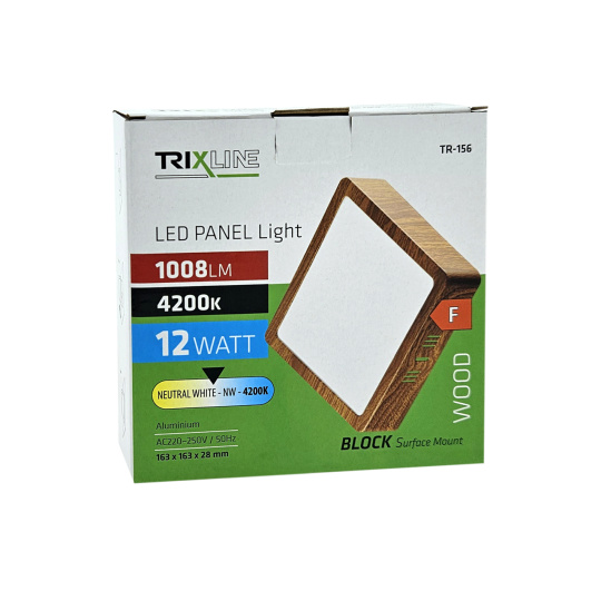 Štvorcový prisadený LED panel Trixline TR-156 s výkonom 12W so svetelným tokom 1008lm a neutrálnou bielou farbou svetla 4200K.Pôsobivý design v dekore dreva. Panel je vyrobený z kvalitného hliníka.Vďaka použitej LED technológii ušetríte až 85% energie.Je určený do interiéru.Vonkajší rozmer svetla je 16,3x16,3x2,8cm.Rýchla a jednoduchá inštalácia.