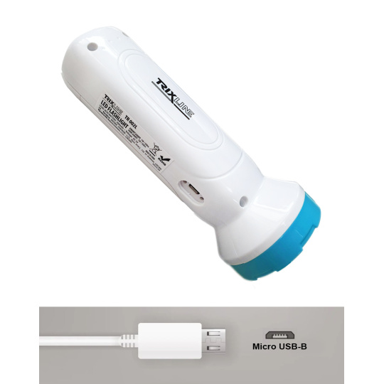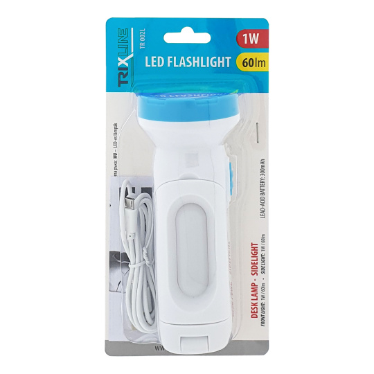 Výhodou LED svietidla TR 002L je USB nabíjanie a možnosť voľby čelného a bočného osvetlenia.Bočné osvetlenie je možné použiť ako núdzové a stolné svietidlo. Na zapnutie a voľbu režimov predného a bočného svietenia slúži vypínač umiestnený na tele svietidla. Pred prvým použitím svietidlo plne nabite Micro USB B káblom (súčasť balenia). Svietidlo nabite aj v prípade, že nie je pravidelne používaná (1x za 3 mesiace), predĺžite tým životnosť akumulátora). Svietidlo má bielu farbu s tyrkysovo modrým okrajom.
