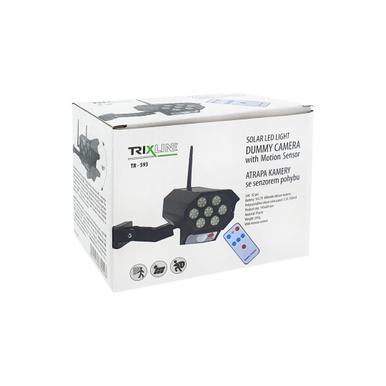 Vonkajšie výkonné LED 42ks SMD osvetlenie TR-593 Trixline - imitácia CCTV kamery má zabudovaný solárny panel, pohybový senzor s detekciou pod uhlom 120 ° a dosahom 3-5m. Súmrakový senzor - cez deň sa nabíja v noci rozsvieti.Vďaka solárnemu panelu ušetríte energiu a nie ste obmedzení pripojením do elektrickej siete. Svetlo pripomína kameru, osvetlí priestor a tým odradí pohyb nežiaducich osôb. Skvelá voľba pre osvetlenie okolo domu, záhrad, príjazdových ciest, stavenísk, garáží, parkovísk, rekreačných pozemkov, chát, kempov a pod. Vyrobené z kvalitného plastu so stupňom krytia IP44 . Súčasťou balenia je diaľkové ovládanie. Jednoduchá montáž. Odporúčaná výška inštalácie 2-3m nad zemou.
